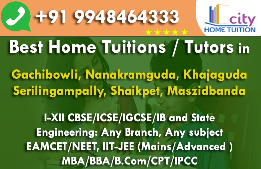 First of all City Tuitions provides quality Tutoring Services for,KG-X Class CBSE,ICSE,IGCSE,IB Tuition in Nanakramguda.XI-XII Class Intermediate Home Tuitions in Nanakramguda.